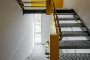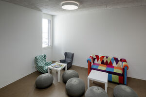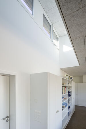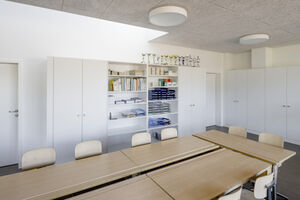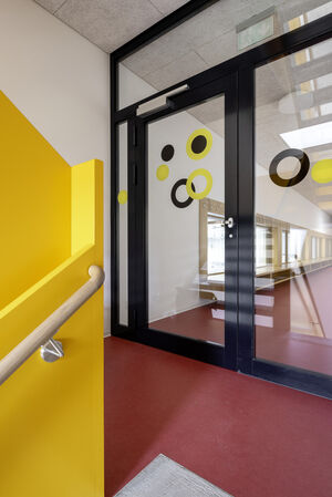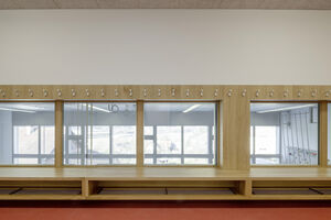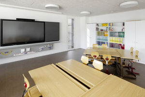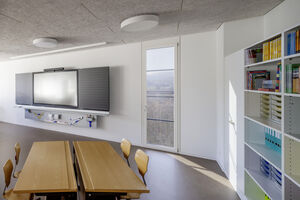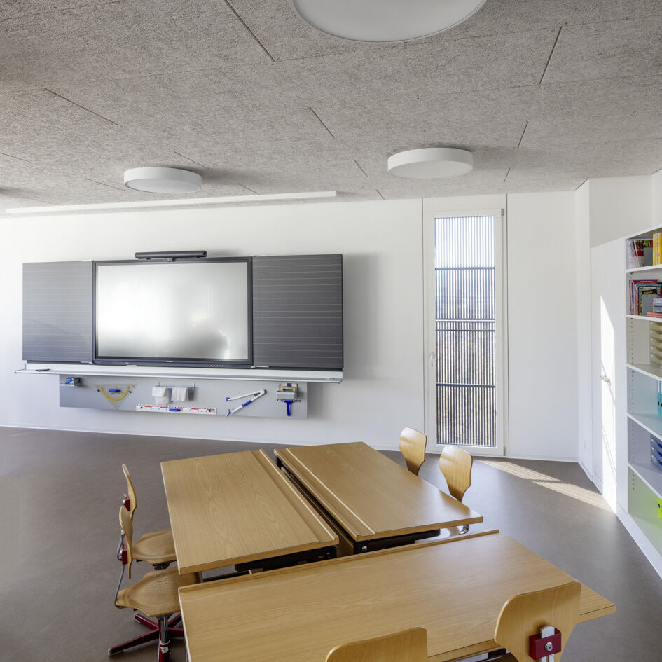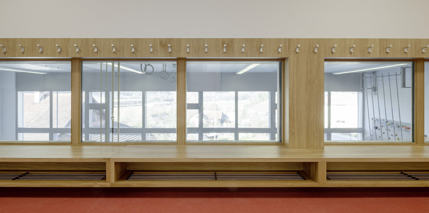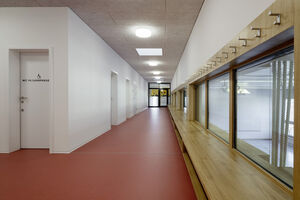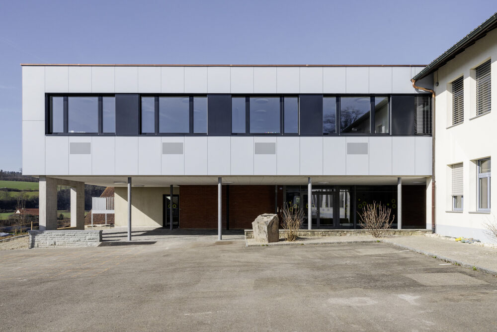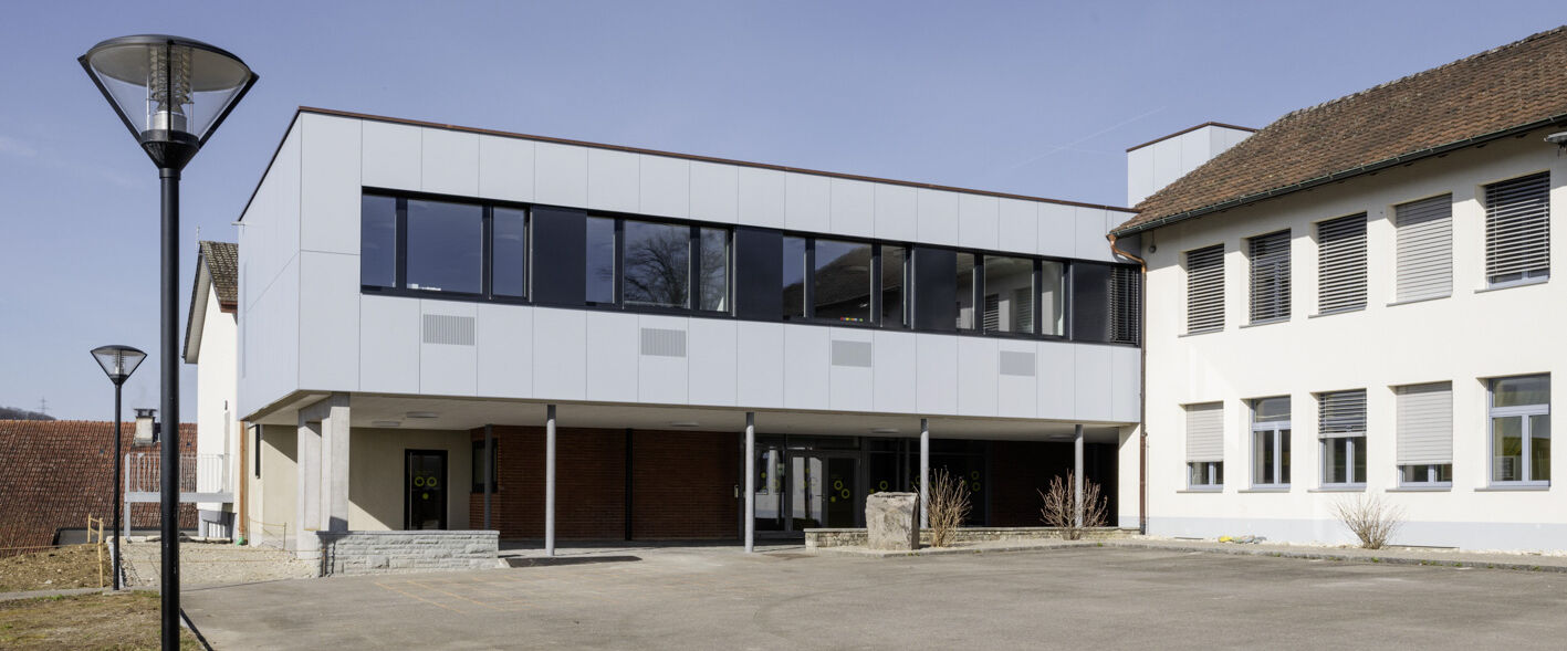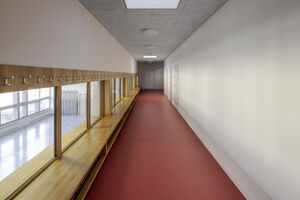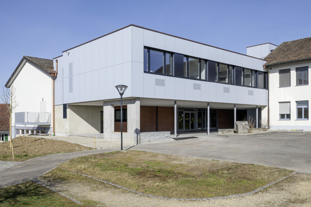 Mit der Aufstockung konnten 3 Klassenzimmer, 1 Gruppenraum, sowie geschlechtergetrennte WC-Räume mit IV WC realisiert werden. Das Obergeschoss und die Bühne der Turnhalle sind durch das Fluchttreppenhaus neu erschlossen. Der grosszügige Erschliessungsbereich mit den Garderoben dient auch als Durchgang zum bestehenden Schulgebäude. Der Einbau einer Liftanlage ermöglicht barrierefreien Zugang zu Ober- und Dachgeschoss des bestehenden Schulgebäudes. Das Dachgeschoss dient dort als Lager- und Archivraum. Gemäss Sockel und Fensterfarben der beiden bestehenden Gebäude wurde das neu verbindende Volumen mit vorgehängten Fassadenplatten verkleidet. Die Innenräume sind durch natürliche und helle Material- und Farbgebung bestimmt. Die Decken sind durchgehend mit Holzwolle - Akustikplatten verkleidet, die Wände mit weissen Glasfasertapeten ausgestattet. Entsprechend sind auch Arbeitssimse und magnetische Schrankfronten in den Lehrräumen in Weiss gehalten. Lediglich farbige Bodenbeläge sorgen mit warmen Farbtönen für Akzente. In den Klassenzimmern kontrastiert ein erdig brauner Linoleumbelag, im Erschliessungskorridor schafft der rubinrote Bioboden wohnliche Wärme. Ergänzend rundet die Garderobenfront in Eiche den behaglichen Eindruck ab. Sie ermöglicht Durchblicke in die Turnhalle und lädt zum Verweilen ein.