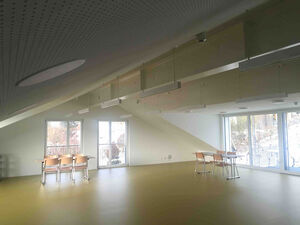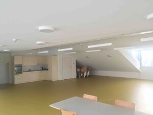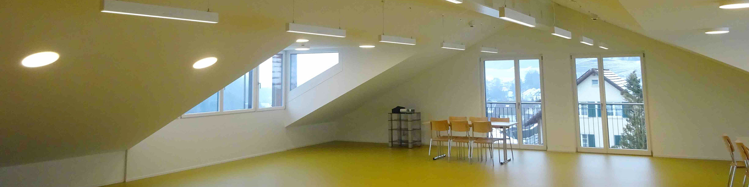 Im Obergeschoss des Neubaus wurden fünf neue Bewohnerzimmer geschaffen. Auf dieser Ebene sind Altbau und Neubau zusammengeschlossen, in der Schnittstelle befindet sich der neue Wintergarten. Im Dachgeschoss ist ein grosser Gemeinschaftsbereich als Aktivierungs- und Gesellschaftsraum entstanden. Die talseitigen Lukarnen und die grosse Fensteröffnung zum Rebberg verteilen das Licht in die Raummitte und gestatten den Ausblick ins Grüne.