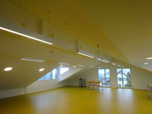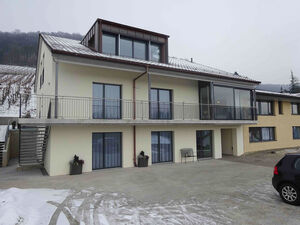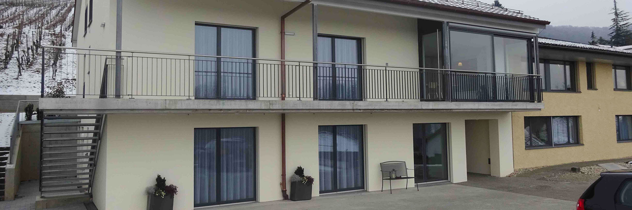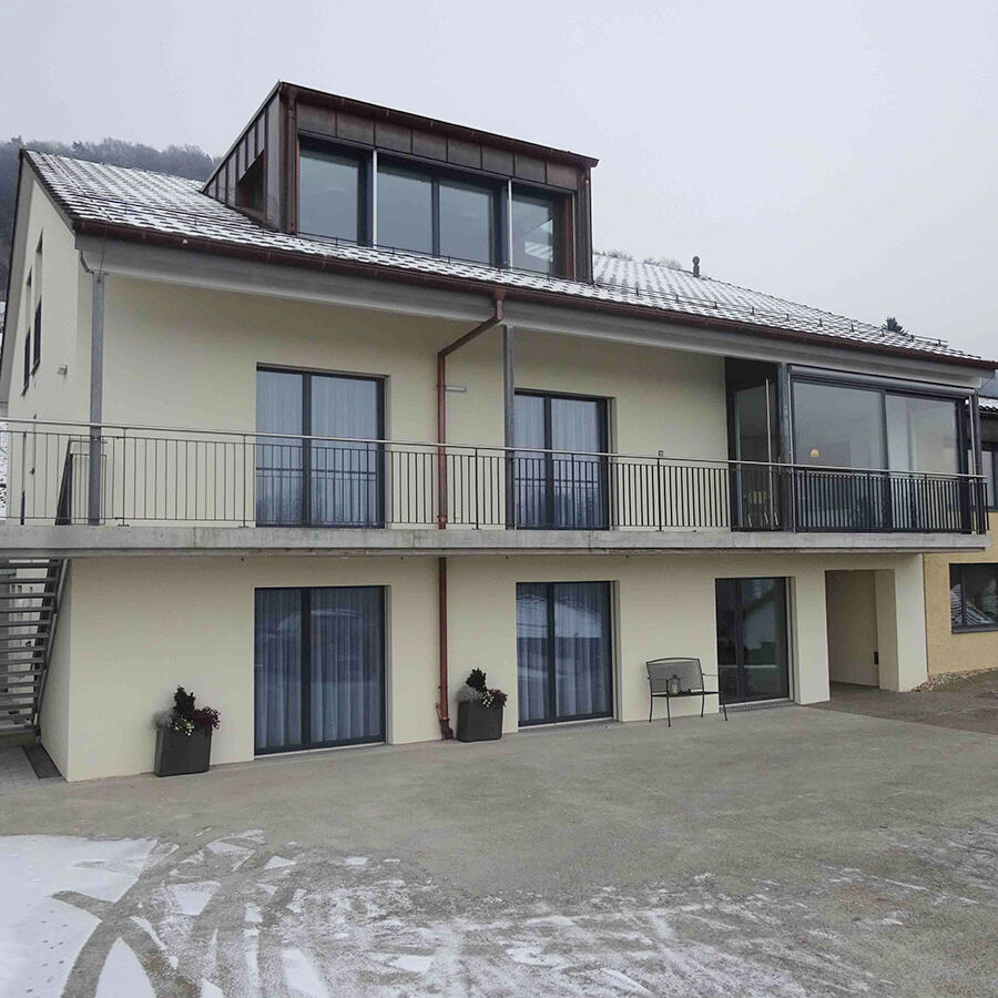 Im Anbau befinden sich vier Bewohnerzimmer, mit ebenerdigem Ausgang und eigener Nasszelle. Hangseitig wurden weitere Lagerräume und der Technikraum erstellt. Die vertikale Erschliessung ist mit einer Liftanlage sichergestellt.