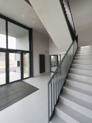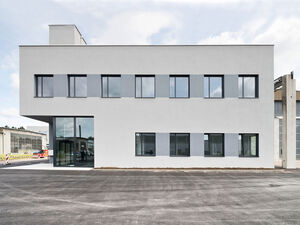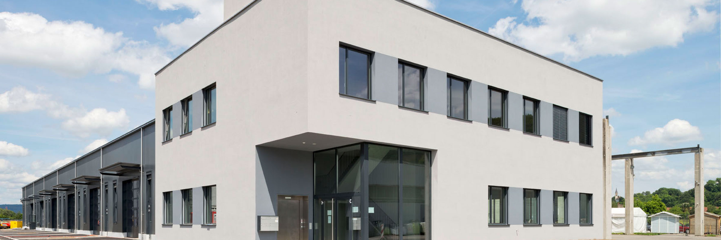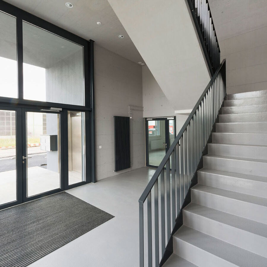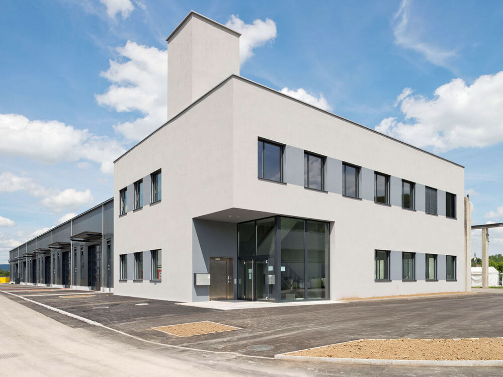Der Neubau besteht aus 2 Gebäudevolumen, dem Kopfbau und einer sich anschliessenden Werkhalle. Mit dem Kopfbau wurde dem Gewerbekomplex beim Zugang ein markantes, representatives Bürogebäude vorangestellt. Im Erdgeschoss sind Werk- oder Büroräume möglich. Im Obergeschoss ist die Physiotherapie Würenlingen eingemietet. Der Bürotrakt kann um ein weiteres Geschoss aufgestockt werden. Die Werkhalle für Industrie und Gewerbe mit einer Länge von 88m kann flexibel, in jeder Achse unterteilt werden. Der Kopfbau mit Kratzputzstruktur nimmt Bezug auf die ehemals hier produzierten Betonelemente der Firma Formbeton. Das langezogene Gebäudevolumen mit anthrazitfarbiger Metallfassade, setzt sich vom Kopfbau ab und tritt zurück.