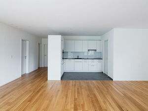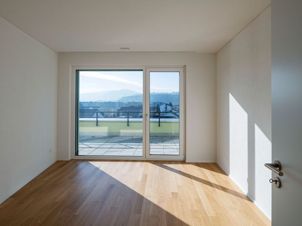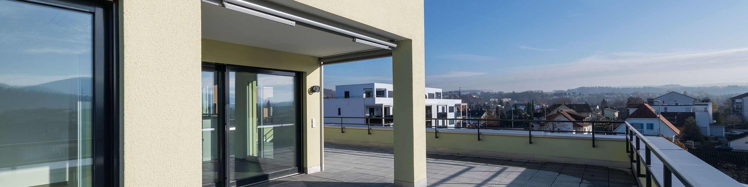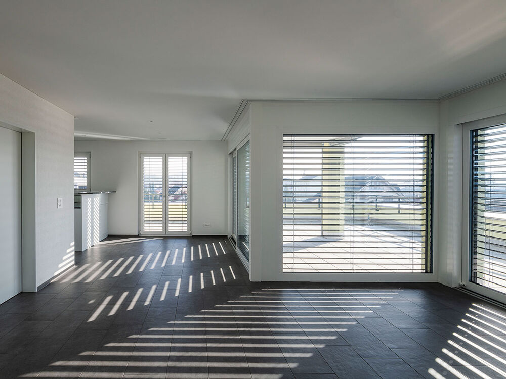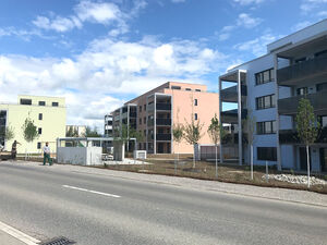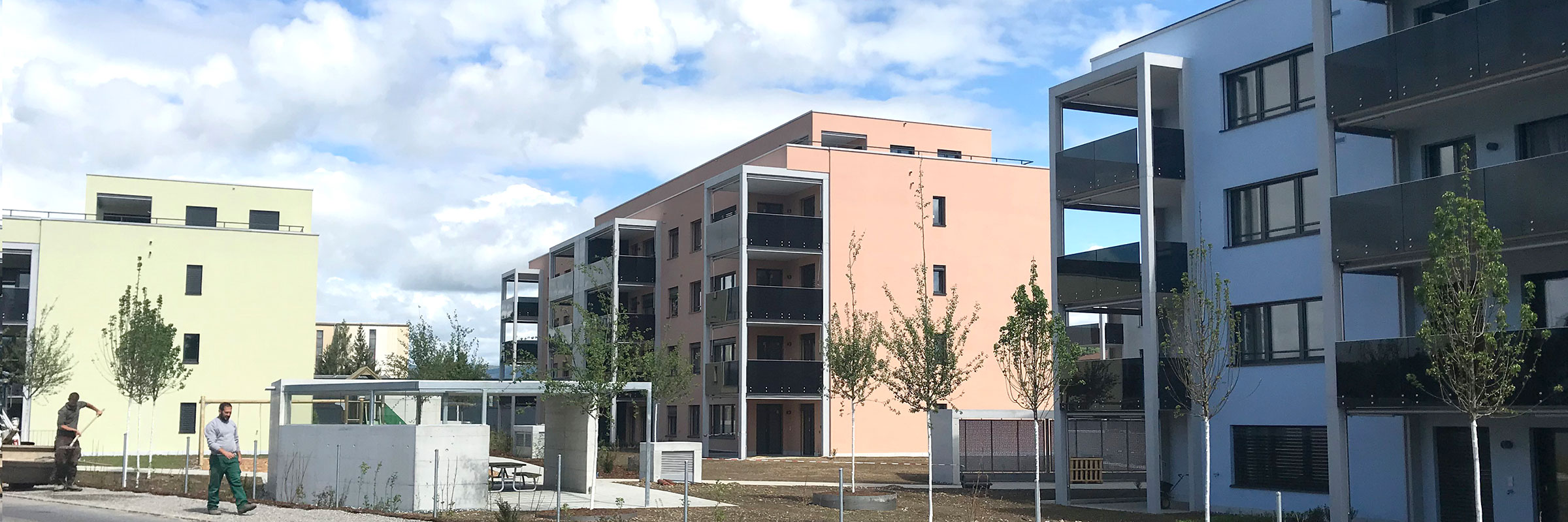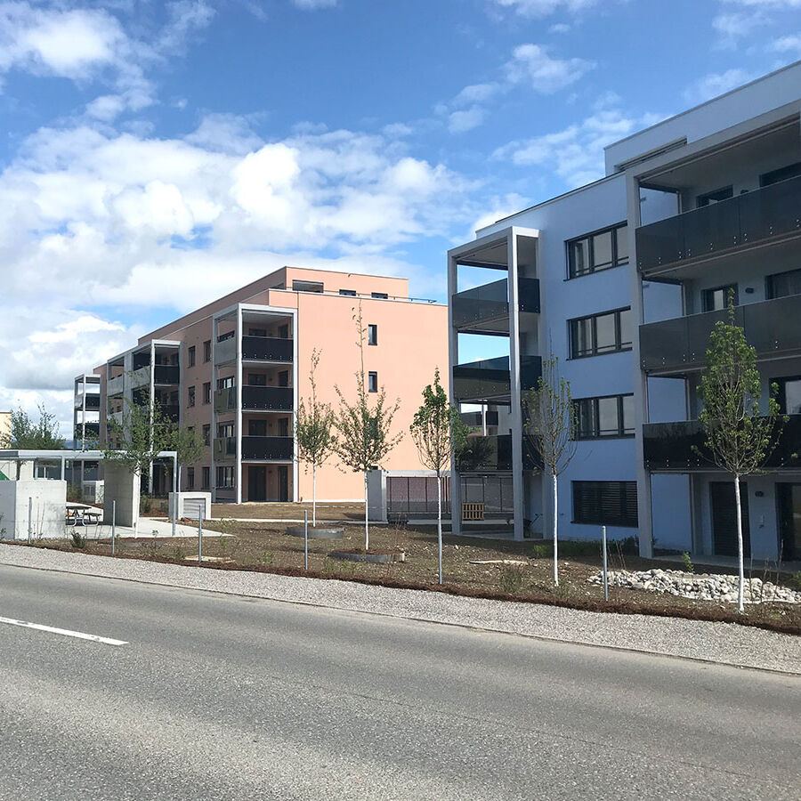 Die leicht abgewinkelte Position der Bauwerke zur Kantonsstrasse wirkt sich positiv auf die Lärmbelastung aus. Mit der Staffelung der Gebäudekörper werden grosszügige Freiflächen in der Umgebung geschaffen.