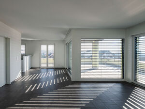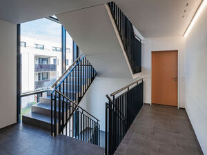 Im nördlichen Grundstücksbereich bei der tiefsten Geländestelle wird die Tiefgarage erschlossen. Die Höhendifferenz zu den südlichen Häusern wird mit einer langen behindertengerechten Rampe überbrückt.