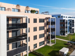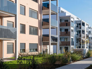 Vier längliche Wohnhäuser mit insgesamt 64 Wohnungen verteilen sich auf 3 und 4 Etagen und je einem Attikageschoss.