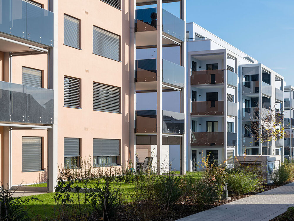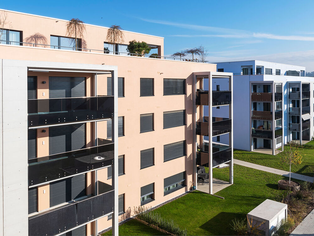 Die Häuser sind in unterschiedlichen Farben gehalten und geben den Bewohnern ihre persönliche Adresse. Die südwestseitig vorgestellten Terrassen mit dunklen Glasgeländern sind prägende Elemente im Gesamtkonzept und halten die vier Bauten zusammen. Den Wohnungen im Erdgeschoss sind Privatgärten vorgelagert. Die übrigen Umgebungsflächen dienen hauptsächlich der Bewegung, dem Spiel und dem gemeinschaftlichen Leben. Zentral ist ein gedeckter, gemeinschaftlicher Aufenthaltsbereich mit Pergola angeordnet.